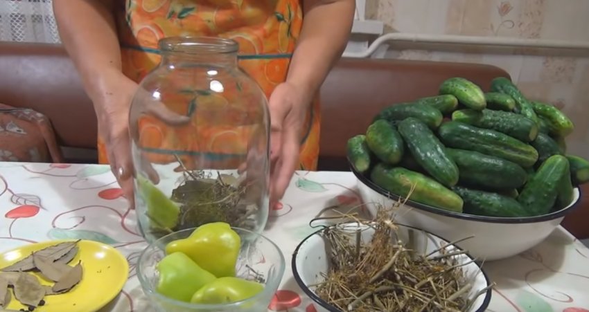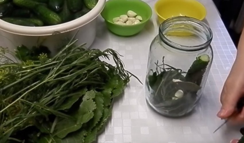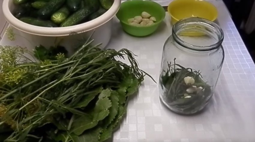 На дно ємності відправляють зелень, часник, лавровий лист і перцевий горошини.![]()