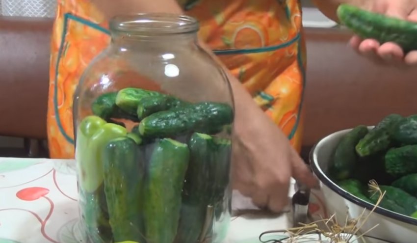- Потім утрамбовували овочі шарами: перший шар з патисонів, другий з огірків, потім з болгарського перцю і заключний — цибулю.