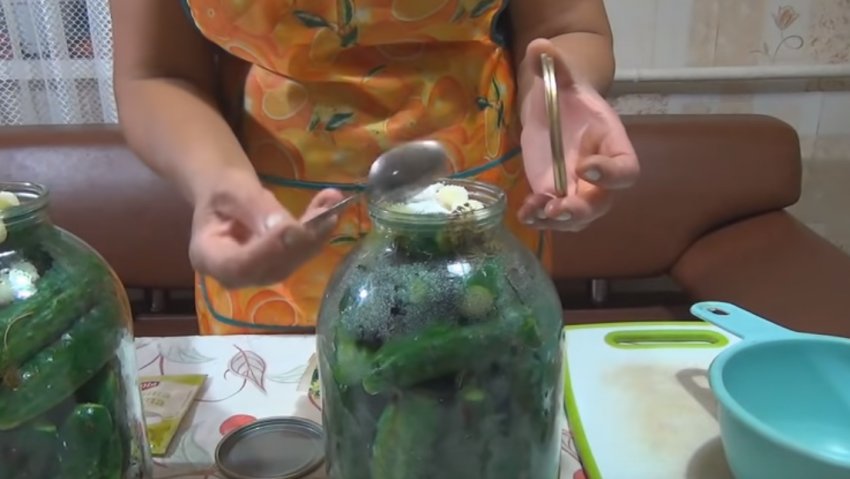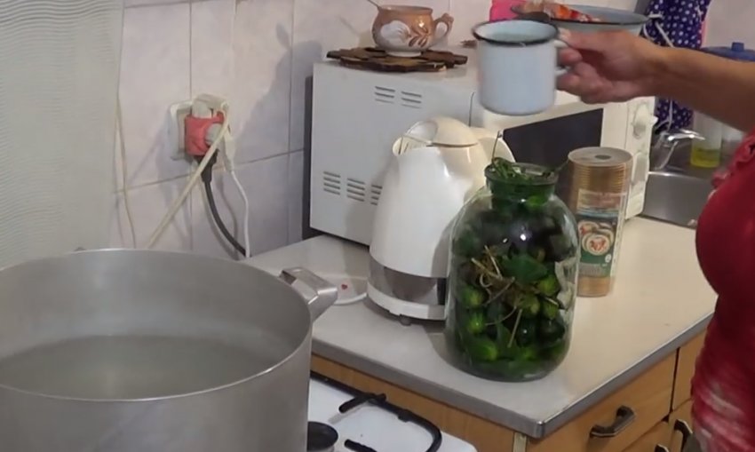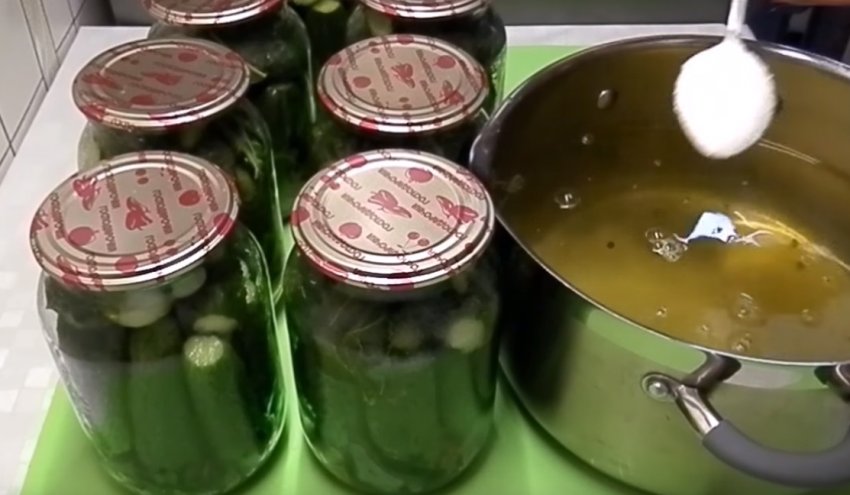 Із злитою з банок (по закінченні вказаного часу) води готується маринад, на літр якого знадобляться 3 ст. л. цукру і 2 ст. л. солі.![]()