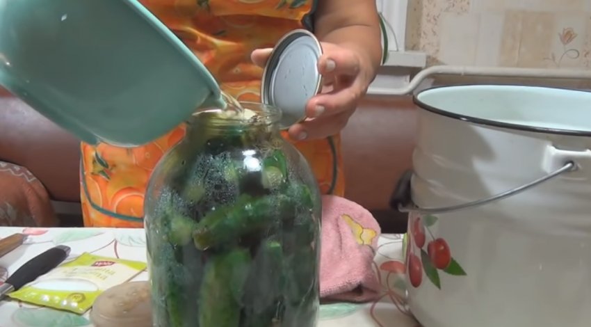 - Заливка складу банки окропом на 15 хвилин.