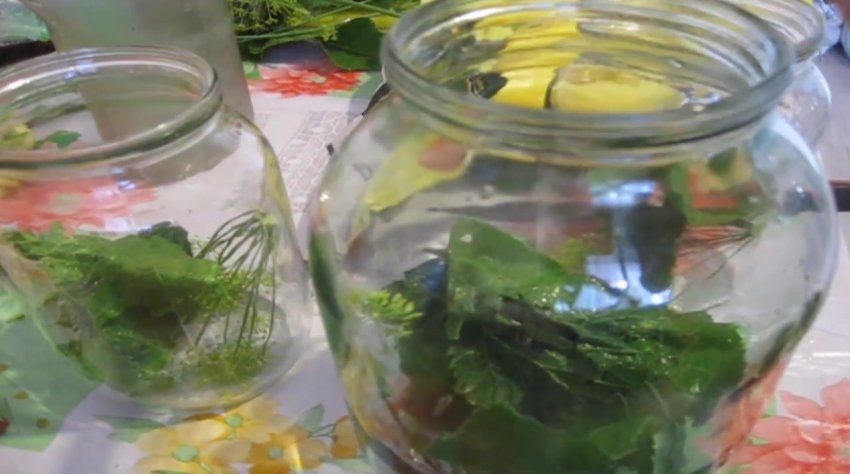 Укласти трави на дно банок: по 2 парасольки кропу і по одному листу кожного виду аркушів, а також по 2 зубки часнику.![]()