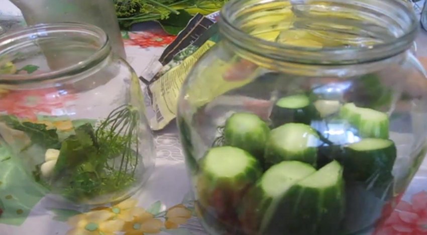 Помістити огірки в ємності до половини, максимально заповнюючи простір.![]()
