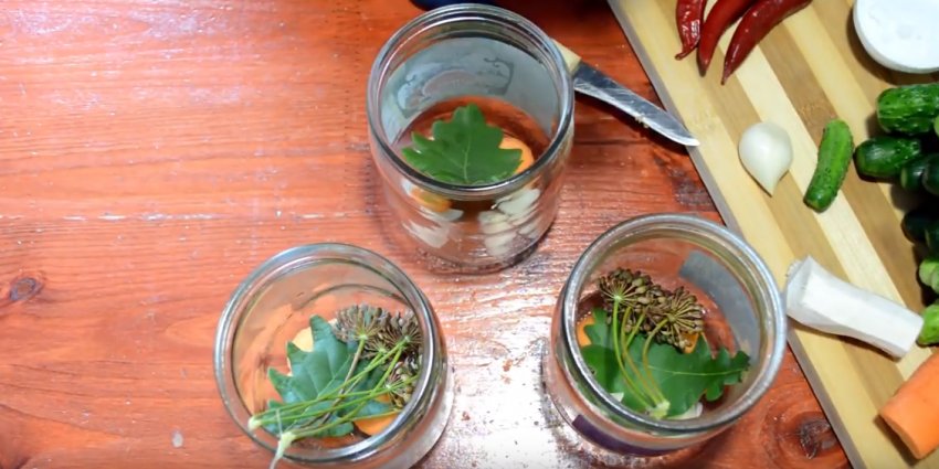 Моркву наріжте кільцями, часник — пластинками. Викладіть їх в банки разом з дубовим листям, парасольками кропу, перцем горошком, гірким перцем і хріном.![]()