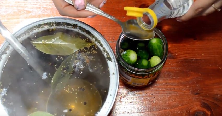 Залийте овочі закипевшим маринадом, додати оцтову есенцію.![]()