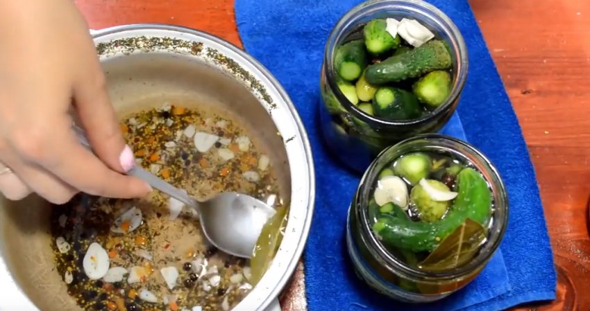Приправи з дна каструлі рівномірно розподіліть по банкам. Закатаю, переверніть догори дном (для додаткової стерилізації кришок гарячим маринадом), накрийте рушником і залиште остигати.![]()