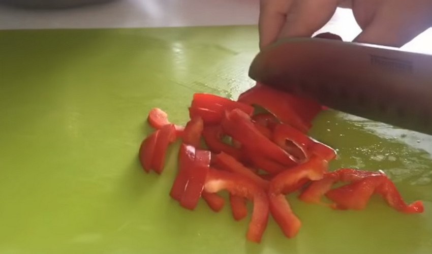 Болгарський перець наріжте дрібними тонкими смужками. Часник можна нарізати слайсами або подрібнити в часничниці.![]()