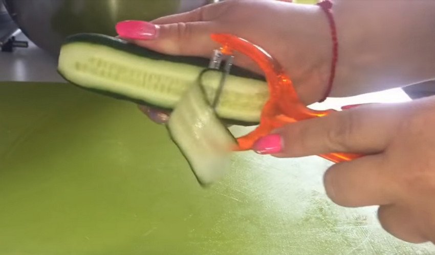 Подрібніть огірки за допомогою овочечистки (тієї, якої ви чистите картоплю) на тонкі смуги (проводити вздовж овоча). Зробити ту ж процедуру ножем складно.![]()