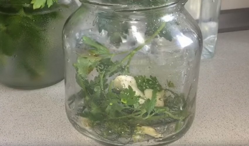 - В заздалегідь підготовлену скляну тару укласти (на 1 літр): зубчик часнику, кілька горошин перцю різного і гілочку кропу. Часник подрібнити, тоді він краще віддасть аромат розсолу.