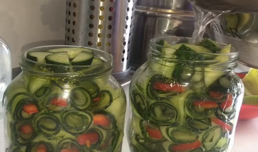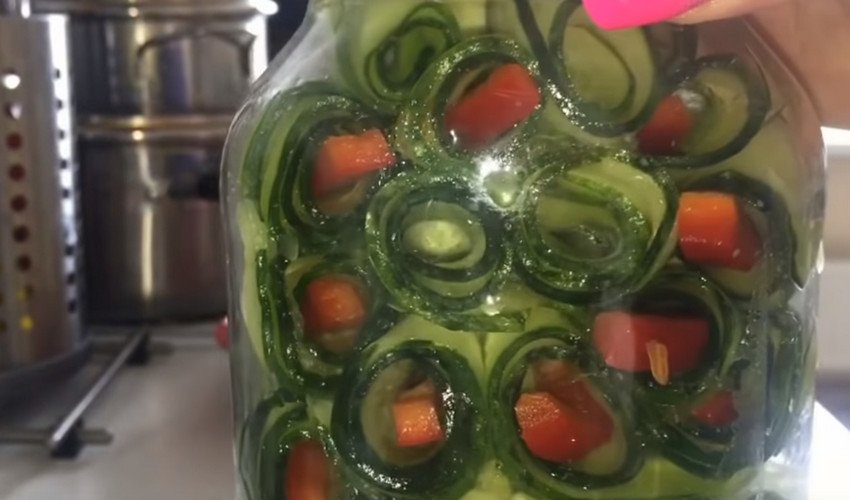 Головна особливість цього рецепту — 1-2 шматочки болгарського перцю загорніть в смужки огірків у вигляді рулетів. Ними наповніть банки під саму кришку, а зверху додайте ще трохи зелені.![]()