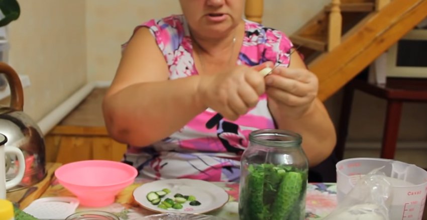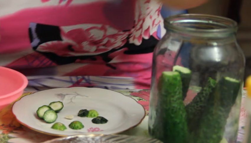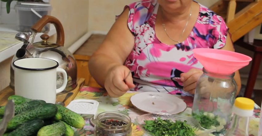 - На дно ємності укладаються: кріп парасольками, можна з гілочками, або трохи насіння, за кілька листочків вишневого дерева і куща смородини, пару великих часникових зубчиків, кілька горошин чорного перцю за смаком, приблизно 4-6 шт. Також пікантності смаку страви додадуть естрагон, дубові листочки і стручок гіркого перцю.