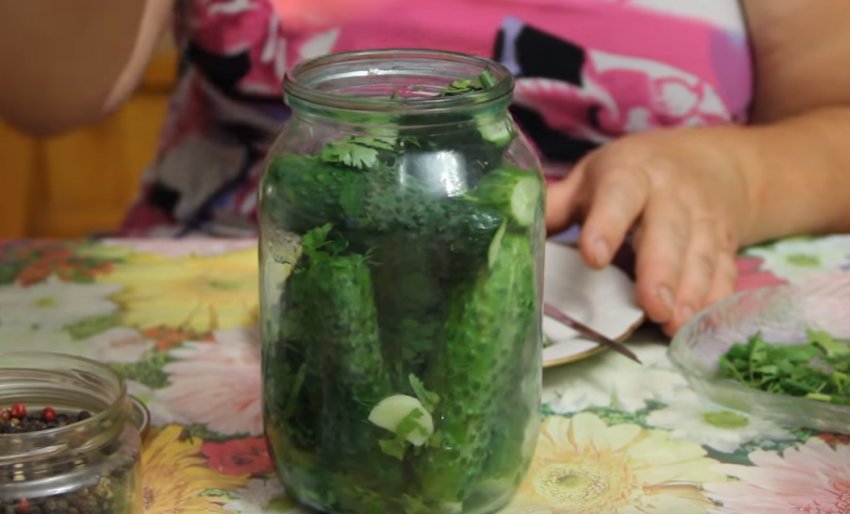 - В банки помістити шар нарізаних огірків, покрити його зеленню і цибулею. Потім знову викласти шар огірків і покрити його подрібненим кропом, петрушкою і цибулею.