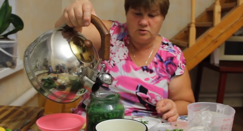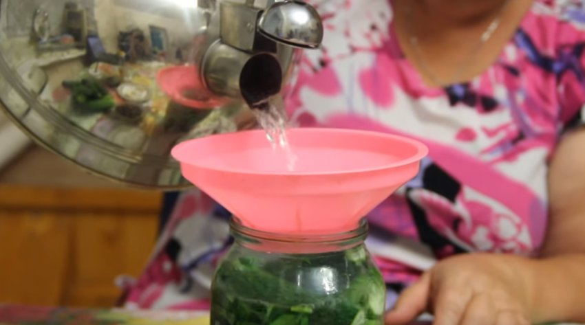 - Залити ємність окропом і дати постояти 3-5 хвилин, потім акуратно злити цю воду в каструлю. Після чого туди додають сіль і відправляють отриманий маринад кип'ятитися.