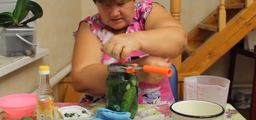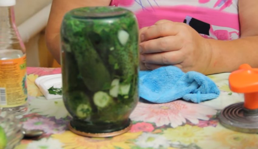 Накрити металевою кришкою. Витримати час, щоб огірки добре прогрілися, а банку трохи охолола до такої міри, що її можна буде взяти руками. Це приблизно 10-12 хвилин.![]()