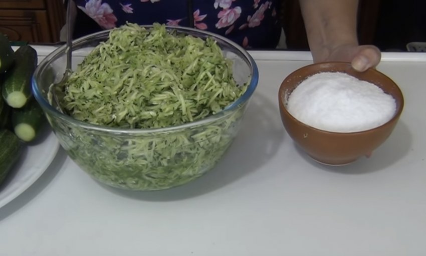 - З допомогою терки подрібніть половину підготовлених огірків (2 кг) та помістіть отриману масу в глибоку миску.