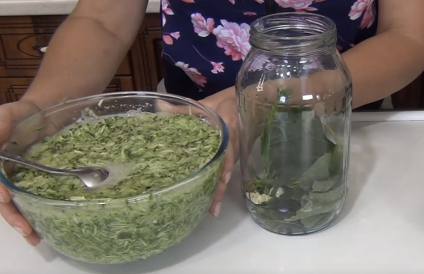 Отриману масу посоліть, додаючи на кожен літр по 2 ст. ложки солі (можна з невеликою гіркою). Важливо дотримуватися пропорції, інакше не виділиться потрібний для заливки сік, і огірки прокиснут. Все добре перемішайте.![]()
