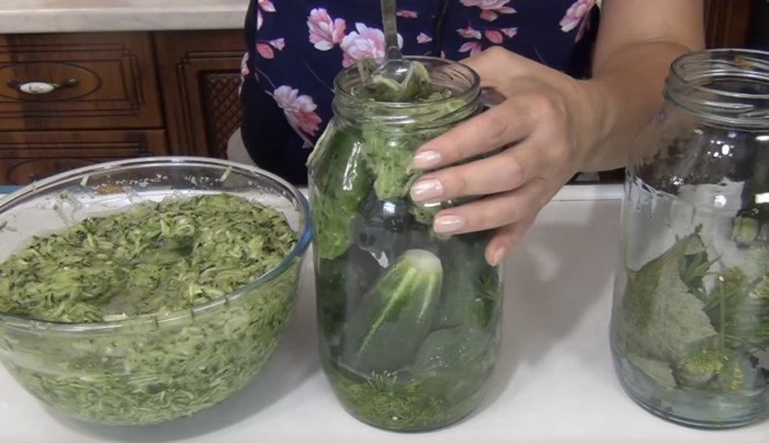 - Зверху покладіть частину огіркової маси і цільні плоди, чергуючи їх верстви до повного заповнення тари.