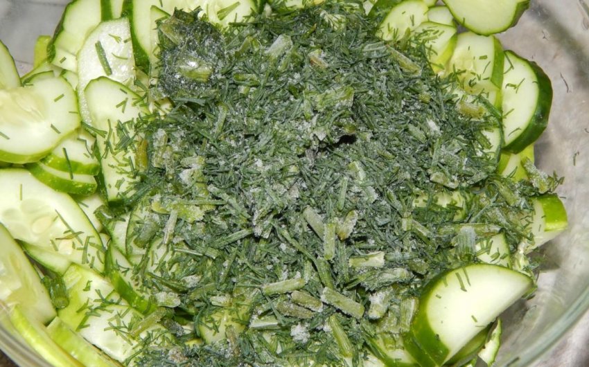 Кріп помити і дрібно нарізати. Всю овочеву нарізку скласти в одну ємність, додати всі інші інгредієнти, перешкодити, накрити і залишити на півгодини.![]()