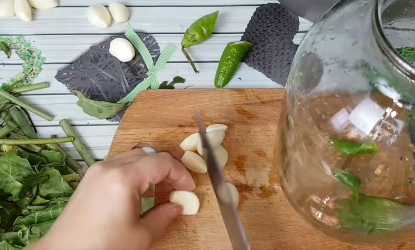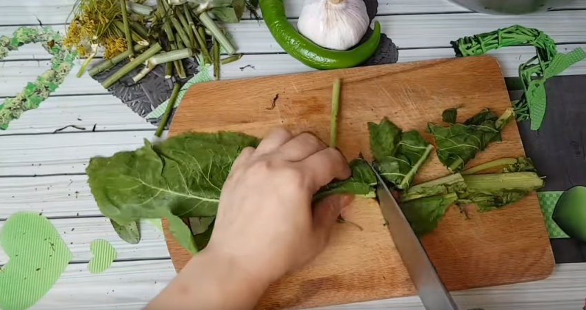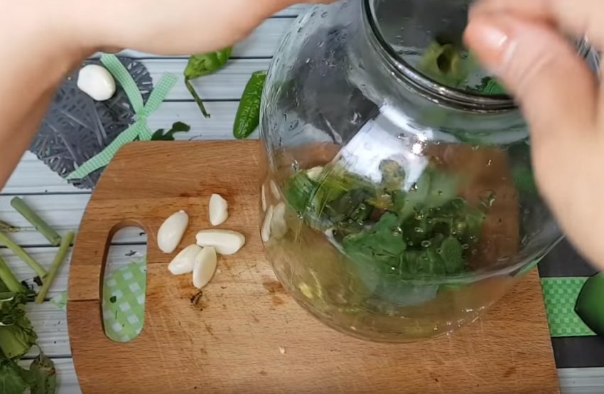 - В тару для консервації покладіть листя хрону і стружку його кореневища, тархун, часник і парасольки кропу.