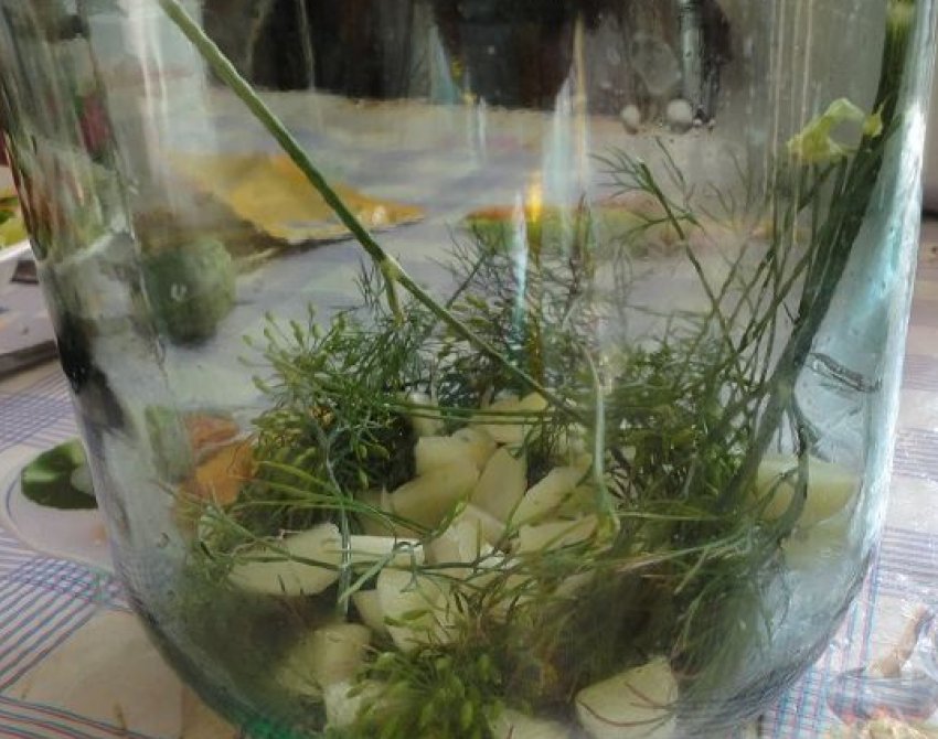 - На дно в підготовлену тару покладіть половину подрібненого кропу, корінь хрону і часник.