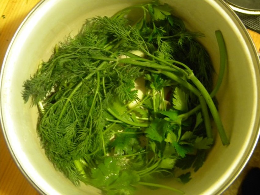 Всю зазначену в рецептурі зелень ретельно миють і укладають на дно трилітрової каструлі.![]()