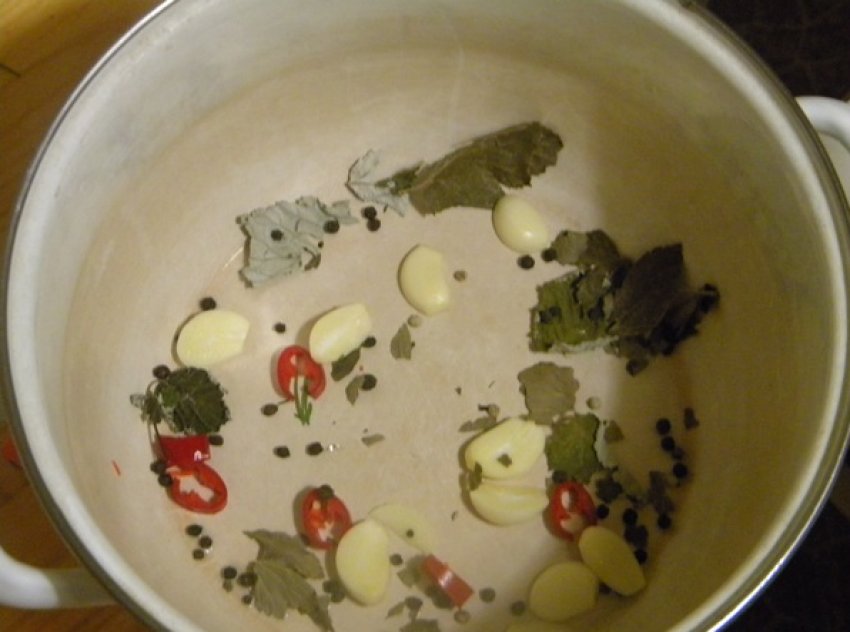Після того додають частину спецій: горошок перцю, гвоздику, подрібнений часник і стручковий перець.![]()