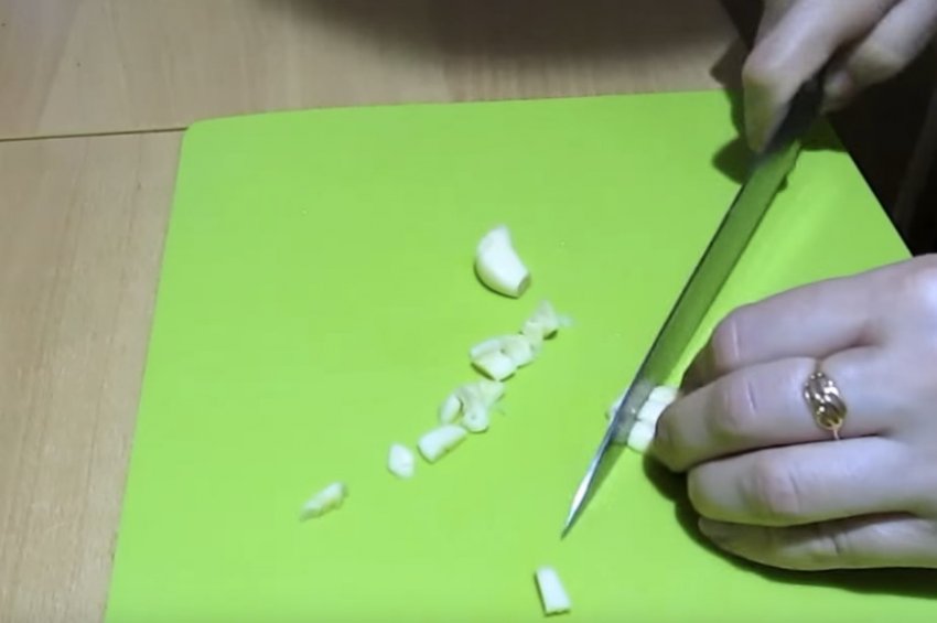 Часникові часточки роздушіть ножем і дрібно наріжте.![]()