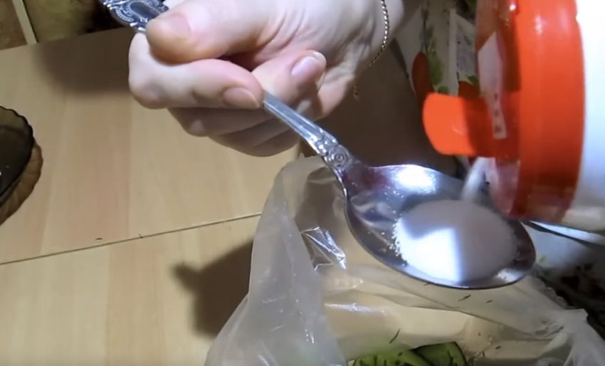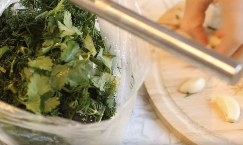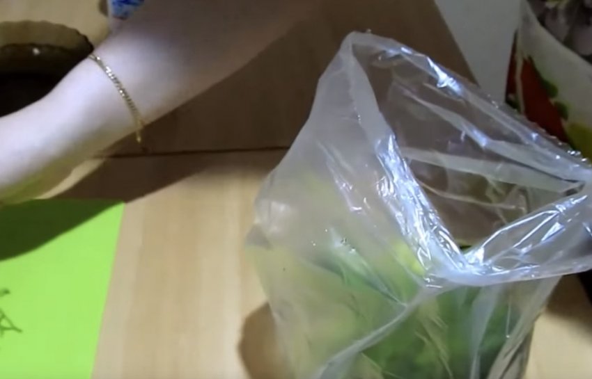 Пакет потрясіть, щоб зелень з часником і сіллю розподілилася рівномірно, і залиште засаливаться на 2-3 години при температурі від +20°С.![]()