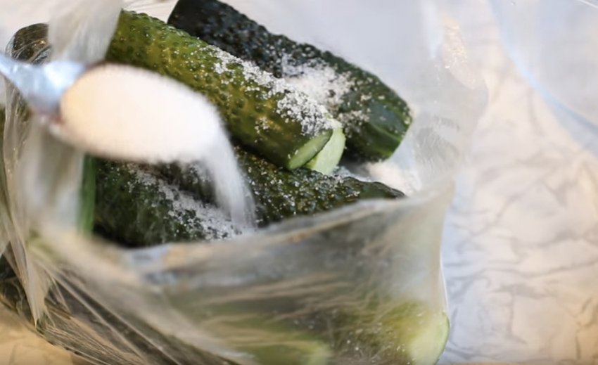 Огірки помістіть в кульок і пересипте їх сіллю.![]()