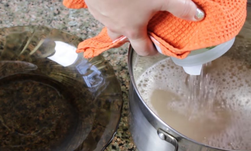 - Разом з плівкою перелити рідину з бутлів в емальований посуд і перекип'ятити.