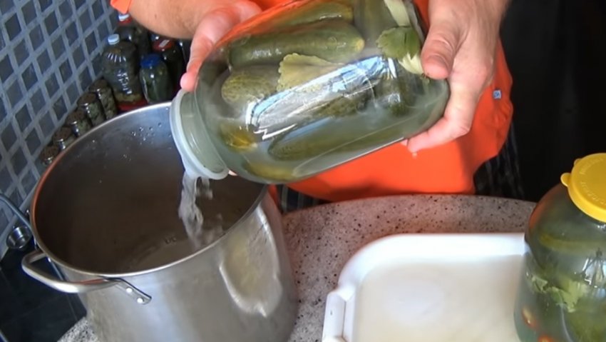 - По закінченню бродіння помутнілий спочатку розсіл стане більш прозорим, оскільки осад опуститься на плоди. Тому розсіл з кожної банки потрібно вилити (її більше не використовують), притримуючи їх вміст. Потім налити холодну воду і потрясти банки, добре прополіскуючи овочі від осаду, а потім вилити цю рідину. Повторити процедуру промивання.