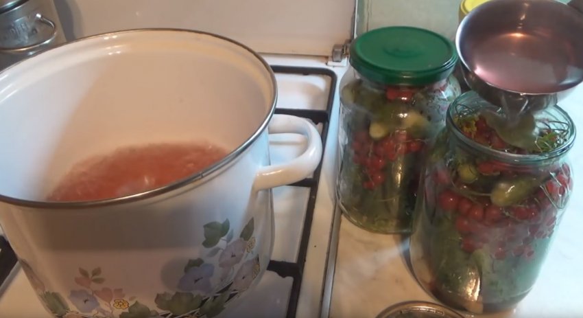 Дати воді закипіти і обережно влити її в ємності. Залишити настоятися 10 хвилин, потім рідину зливають для повторного кип'ятіння. Повторити процес з заливкою, даючи соління настоятися, потім вилити рідину, щоб ще раз закип'ятити.![]()
