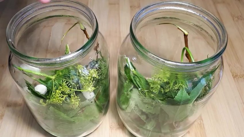 На дно ємностей викладіть листя хрону, вишні і смородини, а укладіть зверху і укропные парасольки.![]()