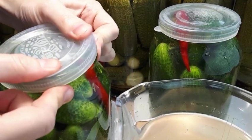 Залийте вміст банок приготованим розчином під самий верх і закрийте ємність щільними капроновими кришками.![]()