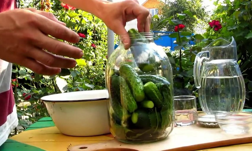 Залийте огірки чистою рідиною (приблизно до половини), влийте приготовлену воду з розчиненою сіллю і при необхідності додайте ще трохи води, щоб вона повністю покривала плоди і доходила до самого горлечка банки.![]()