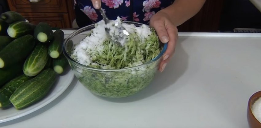 Промийте всі огірки і розкладіть їх на дві купи. У плодів середнього розміру відріжте кінці і замочіть їх у чистій воді на 2-3 години. Великі екземпляри очистіть від шкірки і подрібніть до стану кашки (найзручніше використовувати терку або м'ясорубку).![]()