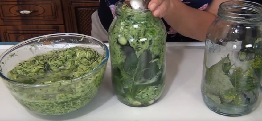 В завершення процесу залишається лише викласти решту огіркову масу і доповнити її залишилися спеціями.![]()