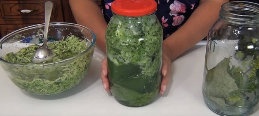 На дно банки викладіть шар зелені, зверху на ньому додайте шар огіркових плодів і знову перекрийте всі травами і спеціями.![]()