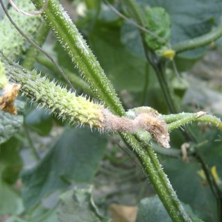 - Фузаріозне в'янення листя. Збудником інфекції також є грибок, який проникає в капіляри куща і перешкоджає нормальному харчуванню рослини. В результаті огірки не отримують необхідні їм поживні речовини, кущ уповільнює зростання, а його верхівка вяне, жовтіє і засихає. Наступним етапом розвитку захворювання є загнивання прикореневої частини стебла та самих коренів. Причиною появи фузаріозу є надмірна кількість органічних добрив в грунті і наявність бур'янів.
