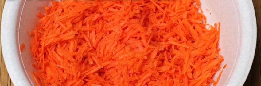 Морквина треться на дрібну тертку, часник подрібнюється кубиками.![]()
