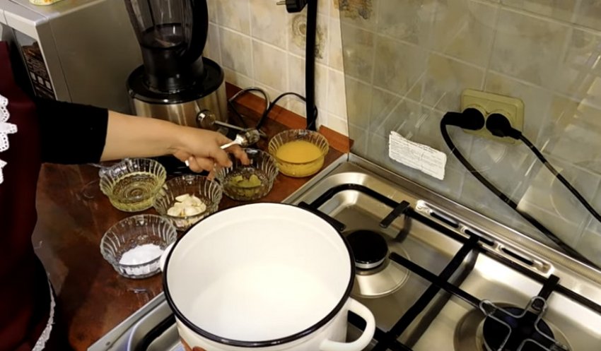У киплячу воду додають спеції, мед і масло. Залишають покипіти 3-4 хвилини.![]()