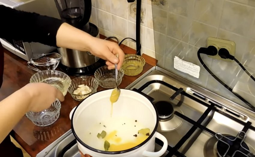 - Охололу воду злити в каструлю, додати спеції, крім оцту, закип'ятити.