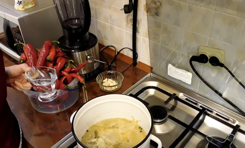 - пробланшировать В киплячій воді 5 хвилин стручки чилі.