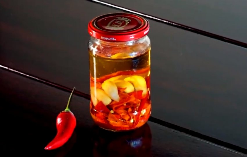 - Злити розчин з ємності з чилі. Зварити новий розсіл за таким же рецептом і знову залити їм гострий перець.