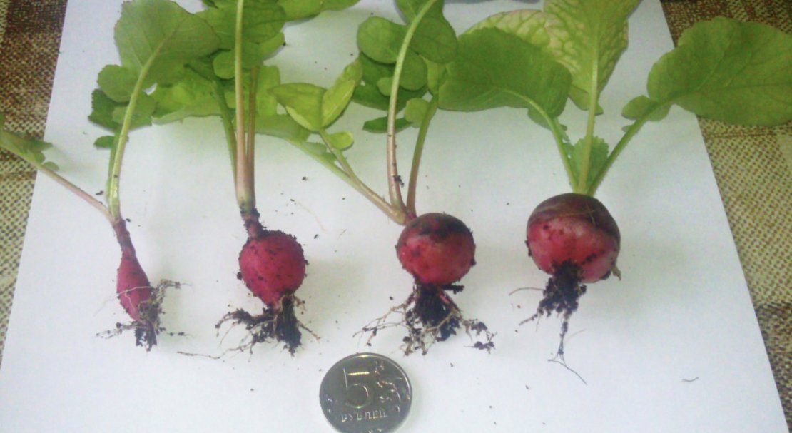 - відносно великі овочі — середня вага одного редиски становить 30 м;