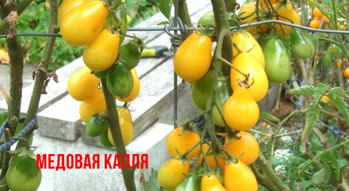 Сорт Медова крапля має середні строки дозрівання. Вимагає обов'язкового підв'язування, оскільки кущі зростають у висоту понад 2 м. Підходить для культивування на грядках і в плівкових парниках. Плоди краплевидної форми, дуже маленького розміру, яскраво-жовті. Врожайність висока. Мають приємні смакові якості. Ідеально підходить для салатів, закусок, маринадів, квашень.