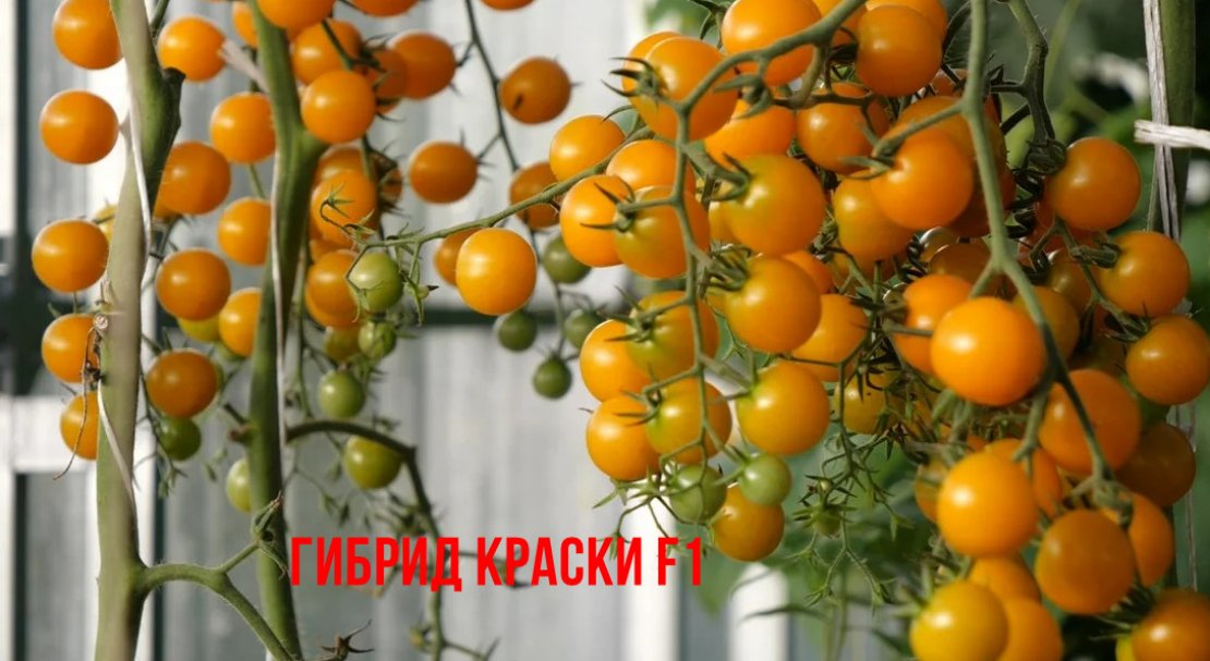 Гібрид Краски F1 дозріває дуже рано. Плоди дрібні, інтенсивно жовтої окраски, круглої форми, дозрівають в гронах. Врожайність середня. Має підвищену стійкість до більшості хвороб. Приємний смак.