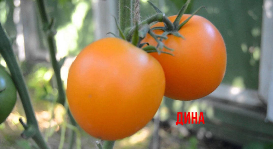 Середньостиглий сорт Дина зростає до 0,7 м у висоту. Підходить для грядок і висадки під плівку. Плоди помідорів мають помаранчевий колір, круглої форми, середнього розміру. Дина має високу врожайність, як для жовтих помідорів. Чудові смакові якості дозволяють вживати помідори як у свіжому вигляді, так і в консервах. Сорт стійкий до хвороб і відсутності поливів. Період плодоношення досить тривалий.