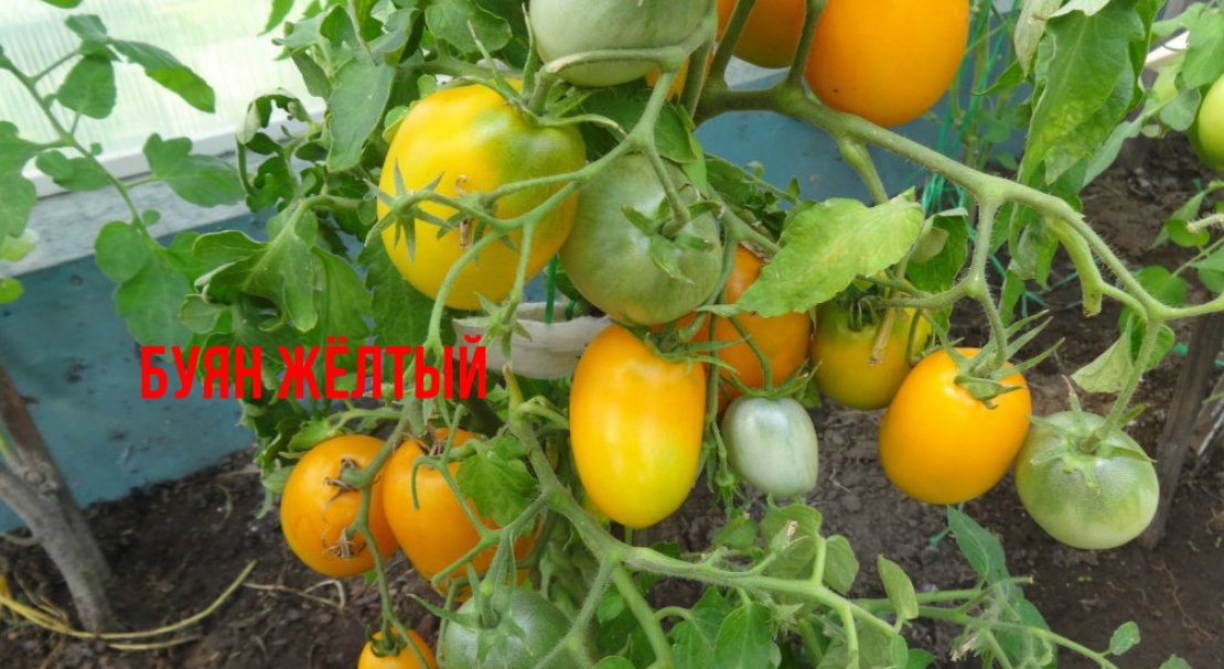 Буйан жовтий — сорт середнього строку дозрівання. Росте до півметра у висоту. Підходить для відкритого ґрунту. Врожайність середня, плоди невеликої форми циліндра. Смак солодкий з легкою кислинкою. Підходить для вживання у свіжому вигляді. Сорт володіє відмінною стійкістю до поганих погодних умов. Зірвані помідори добре зберігаються.