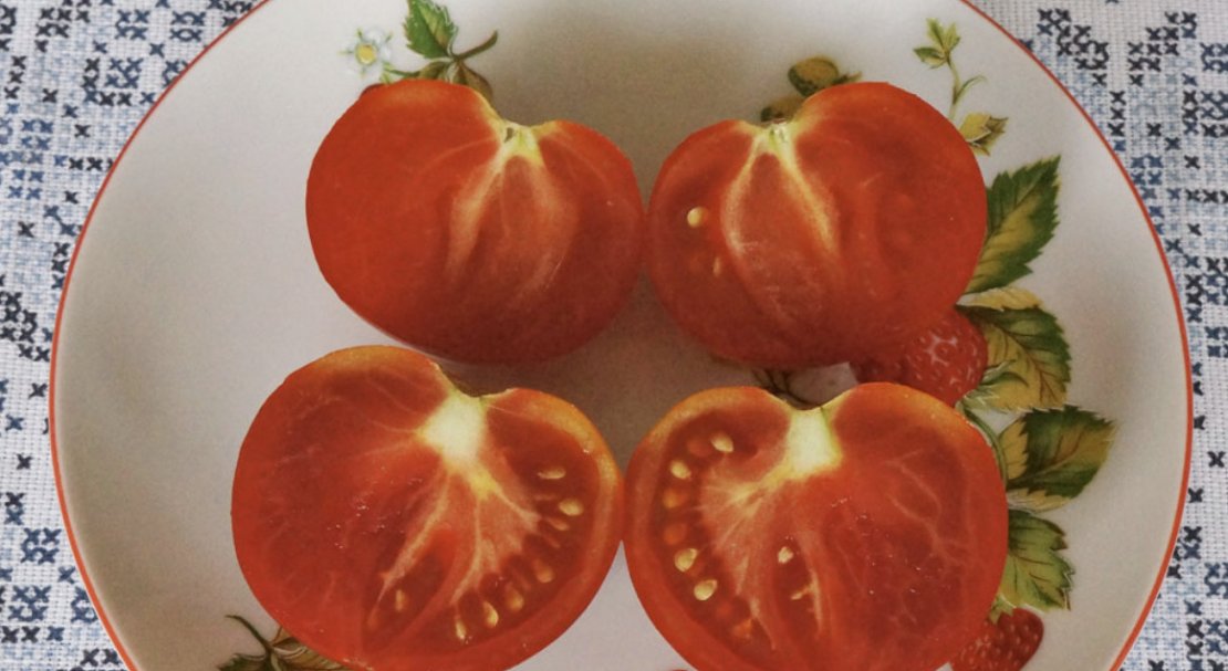 - плоди яскраво-червоного кольору, округлі (іноді з виразною ребристістю), 4-камерні, без зеленої плями у верхній частині;