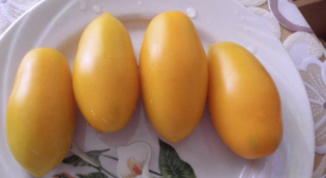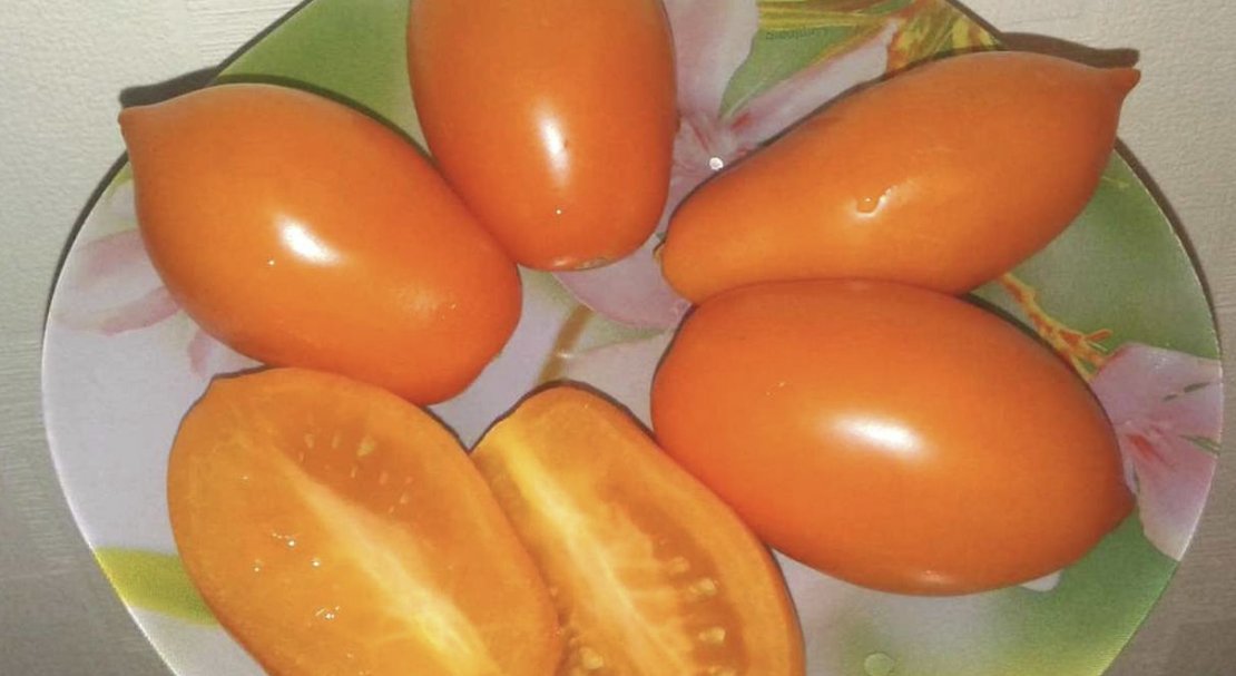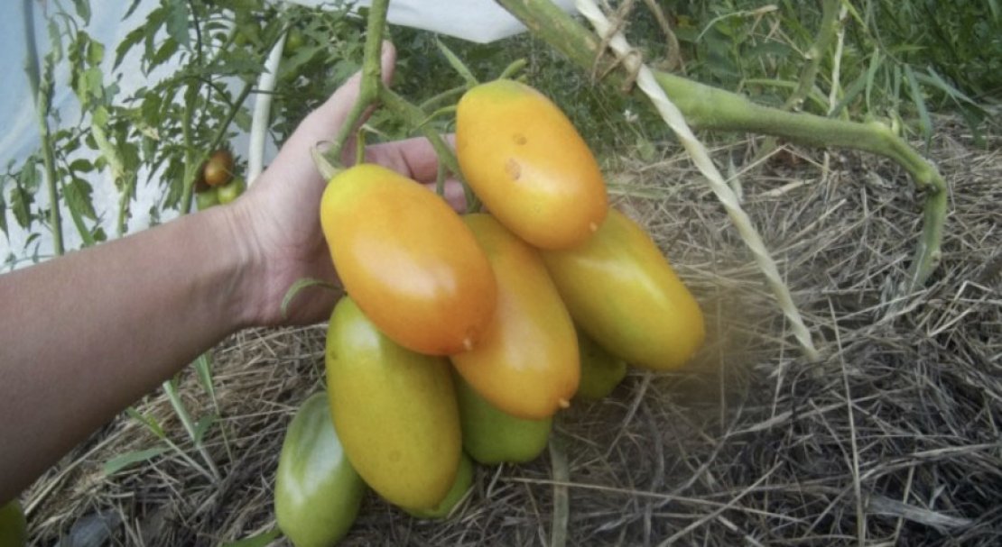 - Плоди овальні, сливовидної форми, висять на кущах гронами по 8 штук. Стиглі помідори мають яскраво-оранжевий колір.
